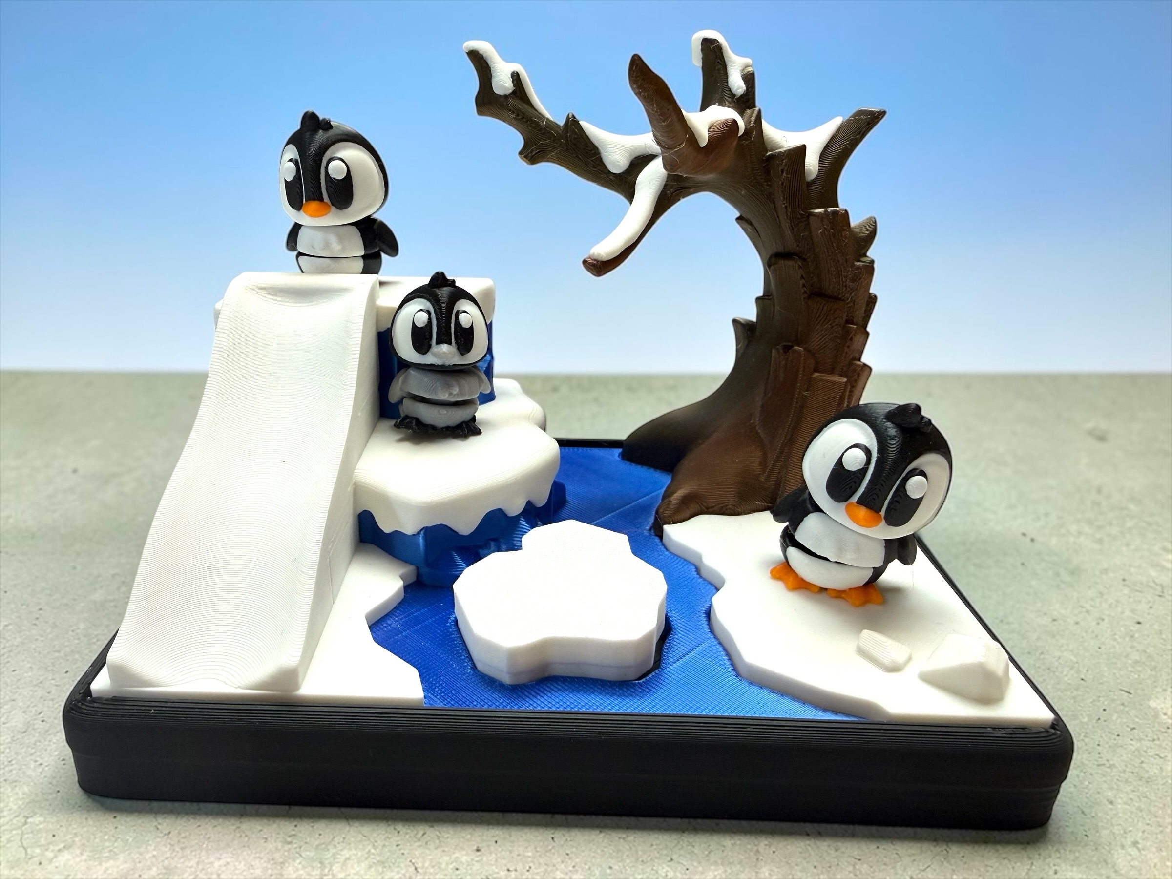 Do you want to play in the snow in the warmth of your own house? Would you enjoy playing with cute little penguins, watching them go down a slide or clickety click on a floating iceberg? Yes?! Then this is perfect for you! Bring a little winter magic to your day with our 3D‑Printed Penguin Playset, a charming miniature world inspired by the icy wonder of the Antarctic. Each set features 3 adorable penguin figures along with a tiny habitat, creating a pocket‑sized scene that feels playful, cozy, and full of personality.